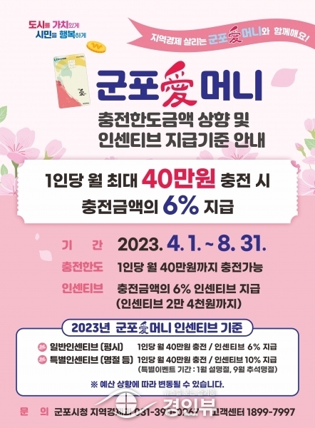 (경인뷰) 군포시가 지역화폐 군포愛머니 월 충전한도를 오는 4월 1일부터 확대한다고 밝혔다.
