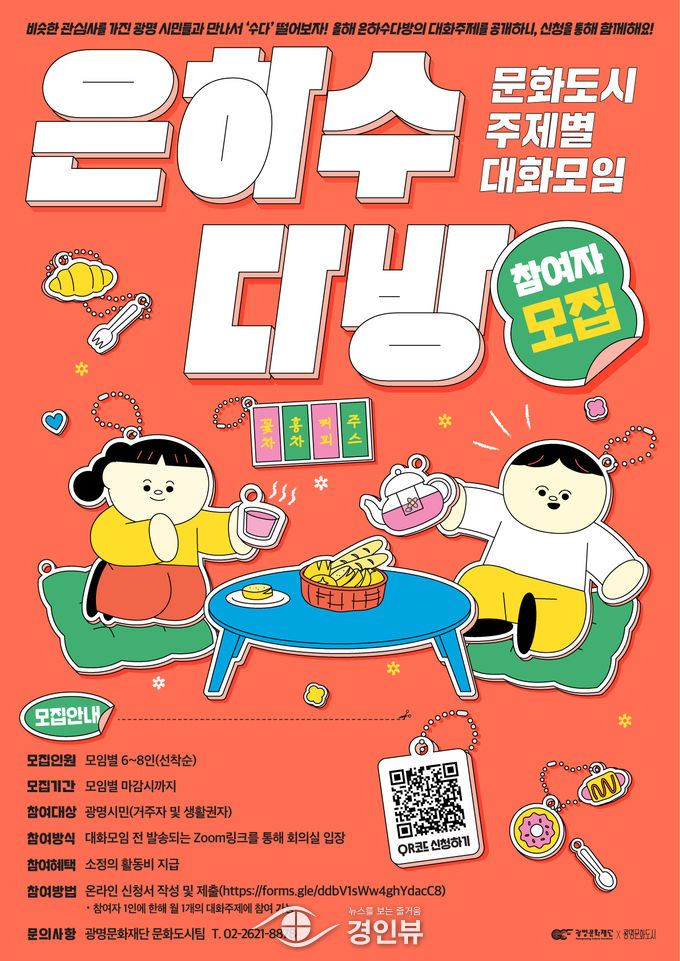 (재)광명문화재단(대표이사 어연선)이 매주 다른 주제로 소통하는 온라인 대화모임 ‘은하수다방’ 참여자 모집에 나선다. ‘은하수다방’은 개인의 작은 관심이 우리의 대화로, 우리의 대화가 모두의 이야기가 될 수 있도록 다양한 주제(환경, 문화, 취미, 생활 등)를 다루는 온라인 대화모임으로, 대화의 지역 의제화를 목표로 한다.
