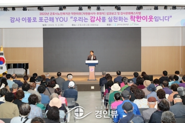 (경인뷰) 군포시는 11월 2일 군포시노인복지관 주최로 2023년 착한이웃 감사문화페스티벌 행사를 열고 군포시 내 감사문화 확산과 노인복지 발전을 위해 지속적인 후원과 끊임없는 자원봉사로 힘써주신 분들을 격려하고 축하했다.