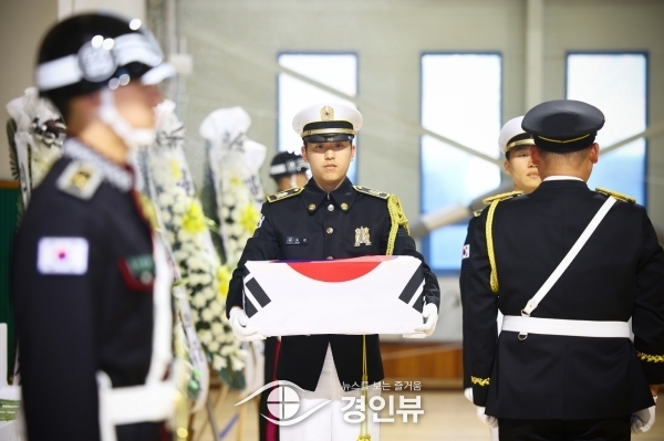 (경인뷰) 지난 21일 의왕시 고천다목적체육관에서 ‘2023년 의왕시 6·25전사자 발굴 유해 영결식’을 엄수하고 호국영령에 대한 추모의 시간을 가졌다.