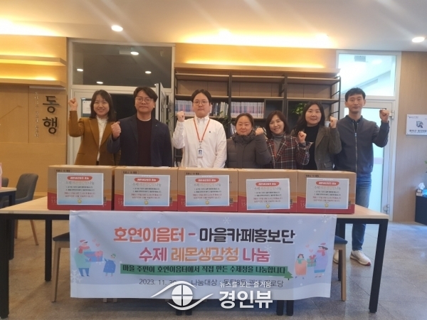 (경인뷰) 화성시인재육성재단 호연이음터는 지난 11월 30일 ‘호연지기-마을카페 홍보단’ 프로그램을 통해 마을 주민이 직접 만든 레몬 생강 수제청을 관내 경로당 5개소에 전달했다.