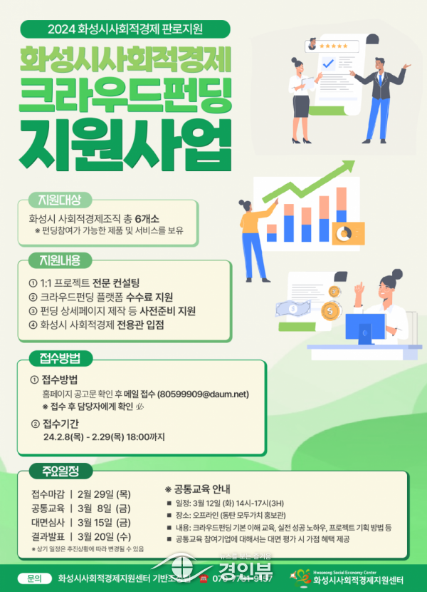 (경인뷰) 화성시가 화성시사회적경제지원센터 주관 ‘2024년 화성시 사회적경제 크라우드펀딩 지원사업’으로 관내 사회적경제기업의 온라인 마케팅 역량 강화와 판로 확대 지원에 나선다.