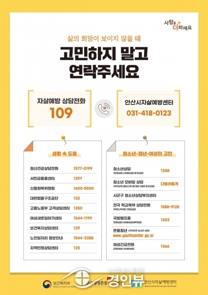 이종하 안산시 자살예방센터장은 “자살 고위험시기 집중 홍보를 통해 시민들이 도움을 받을 수 있는 곳이 주변에 있음을 알리고 생명존중 안전망이 보다 공고히 구축될 수 있도록 노력하겠다”고 말했다.
