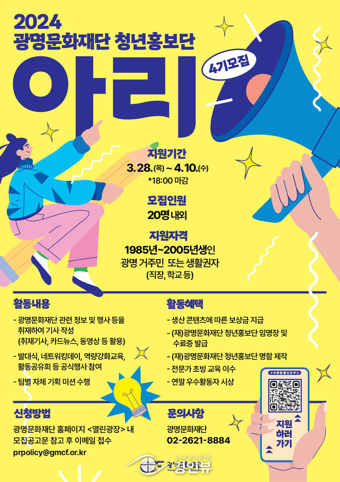 광명문화재단 청년홍보단 '아리' 4기 모집 관련 자세한 정보는 광명문화재단 누리집(www.gmcf.or.kr)을 통해 확인할 수 있다. (문의: 기획홍보팀 02-2621-8884)
