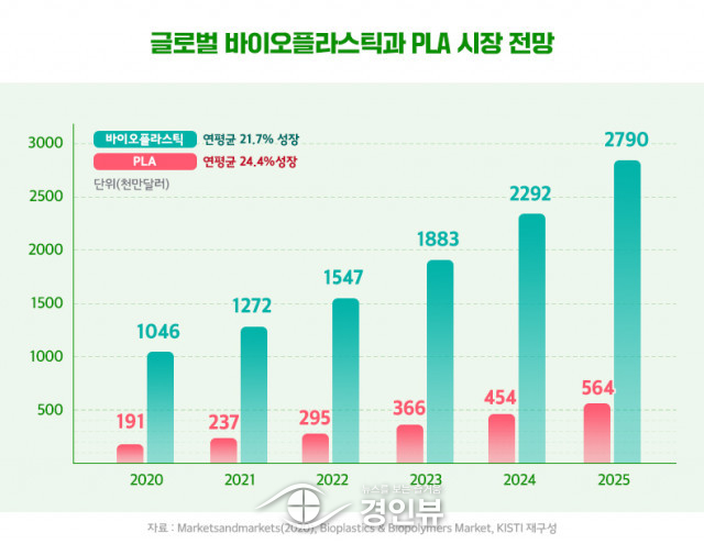 이 중 대표적인 바이오플라스틱인 PLA의 경우 2020년 19억2000만달러(약 2조원)에서 2025년에는 56억5000만달러(약 6조원)으로 전망되며 전체 바이오플라스틱 연평균 성장률보다 2.4% 높은 성장률을 보일 것으로 예상했다.