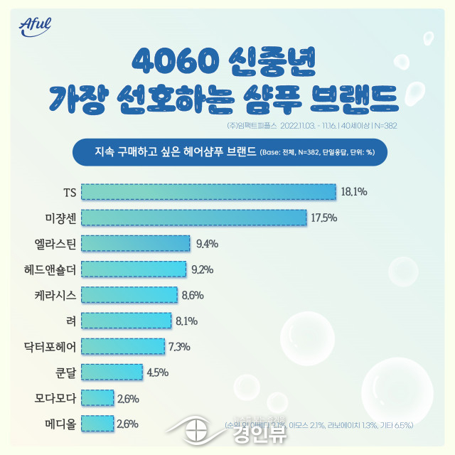 4060 신중년의 헤어케어 제품 이용 및 구매 트렌드 조사 결과, 신중년이 ‘구매를 희망하는 헤어샴푸 브랜드’ 1위는 ‘TS(18.1%)’가 차지했다. 2위는 ‘미쟝센(17.5%)’으로 1위와 단 0.6%의 차이를 나타냈다. 3위는 9.4%의 선택을 받은 ‘엘라스틴’이었다.