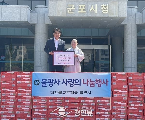 (경인뷰) 군포시 산본로에 위치한 불광사는 23일 군포시청을 방문해 취약계층 가정에 전해달라며 라면 200박스를 기탁했다.