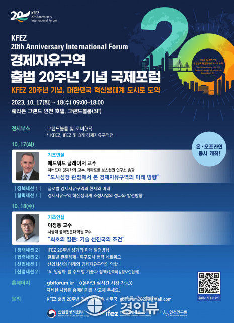 인천경제자유구역청(이하 인천경제청)은 산업통상자원부 경제자유구역기획단과 공동으로 국내외 정부, 지방자치단체, 유관기관, 시민단체, 학계 인사 등이 참여한 가운데 10월 17일~18일 쉐라톤 그랜드 인천에서 ‘경제자유구역 출범 20주년 국제포럼(KFEZ 20th Anniversary International Forum)’을 온·오프라인으로 개최한다고 5일 밝혔다.