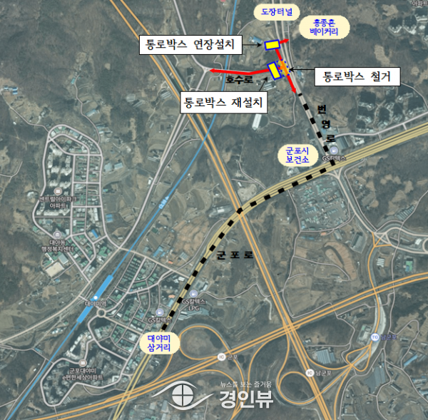정흥수 군포시 건설과장은 “통로박스 철거 및 재설치에 따른 차량통제가 불가피해 공사기간 동안 다소 불편함이 있을수 있지만 우회도로를 이용하는 등 시민들의 적극적인 협조를 당부드리며 이용불편을 최소화하고 안전사고 예방에 최선을 다하겠다”고 말했다.