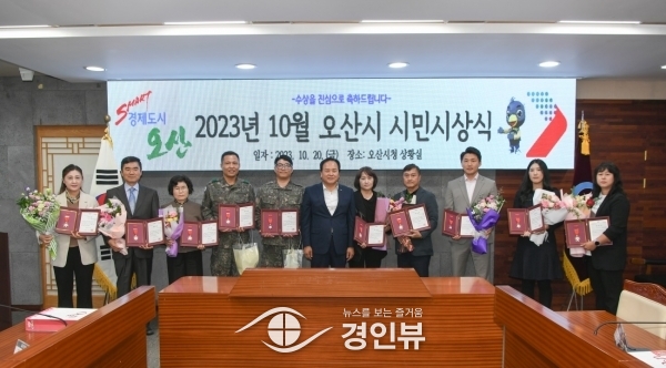(경인뷰) 오산시가 지난 20일 시청 상황실에서 지역사회 발전을 위해 헌신하고 노력한 시민들에게 감사의 마음을 전하는 2023년 10월 시민시상식을 개최했다.