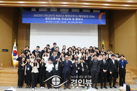 ▲ 2023년 7월 18일 경기 성남시 코이카 본부 대강당에서 2023년 1차(26기) 코이카 해외사무소/재외공관 ODA 영프로페셔널 선발자들이 국내 교육 및 발대식을 마치고 단체 사진을 촬영하고 있다