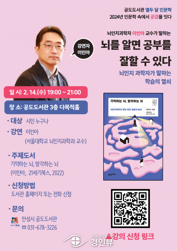 (경인뷰) 안성시 공도도서관은 오는 2월 14일 수요일 오후 7시, '뇌를 알면 공부를 잘할 수 있다'는 인문학 강연을 공도도서관 3층 다목적홀에서 진행한다.