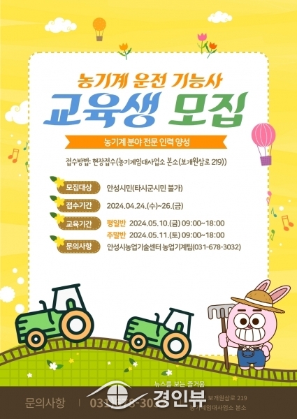교육 기간은 평일반 5월 10일 9시~오후 6시, 주말반 5월 11일 9시~오후 6시로 진행되며 접수 대상은 안성시민이면 누구나 접수 가능하고 농기계 운전기능사 필기과정 교육 수료생 및 청년, 여성 농업인에 한해 가점을 부여한다.