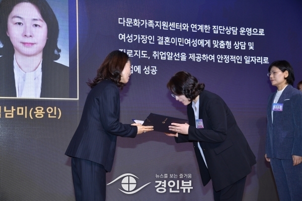 (경인뷰) 용인특례시는 백남미 용인여성새로일하기센터 상담사와 스리랑카 출신의 이용자가 지난달 28일 서울 마포중앙도서관에서 열린 노동부·여성부 공동 주관 ‘제13회 여성새로일하기센터 유공 포상식’ 집단상담프로그램 우수사례 공모전 부문에서 최우수상인 고용노동부 장관상을 받았다고 4일 밝혔다.