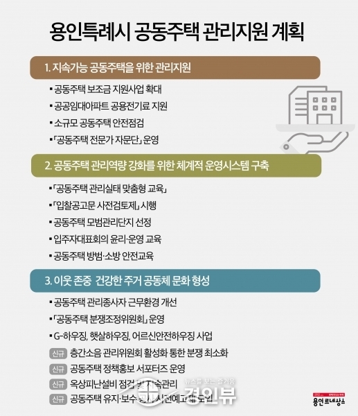 (경인뷰) 용인특례시는 공동주택 공용시설 개·보수 보조금 지원 확대, 건강한 주거공동체 문화 조성, 층간소음관리위원회 활성화 추진 등을 골자로 하는 공동주택 관리지원 종합계획을 수립해 시행한다고 18일 밝혔다.