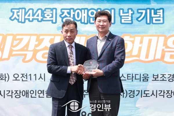 경기도시각장애인연합회 정태곤 회장은 시각장애인의 복지 증진을 위해 노력해 온 이상일 용인특례시장에게 감사의 뜻을 담아 감사패를 전달했다.