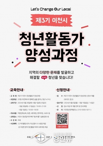 청년활동가 양성 과정은 각 분야의 전문가를 초청해 다채로운 커리큘럼을 진행해 지역문제에 관심있는 청년들을‘청년활동가’로 양성하고 청년들이 직접 지역 문제를 발굴·해결하며 다양한 분야에 역량을 갖춘 청년 리더로 양성하고자 이천시의 지원을 받아 오는 5월 28일부터 6월 1일까지 5일간 청년일자리카페 ‘청년e-room’에서 진행한다.