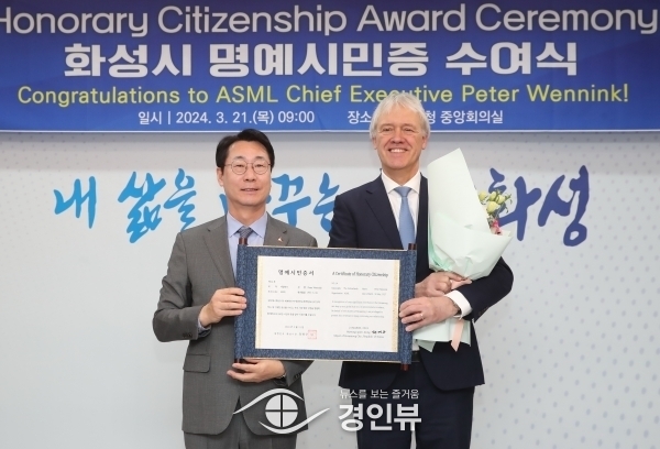 ▲ 지난 3월 화성시장이 반도체 노광장비분야 세계 1위 기업인 ASML의 CEO 피터 베닝크에게 명예시민증을 수여하는 모습