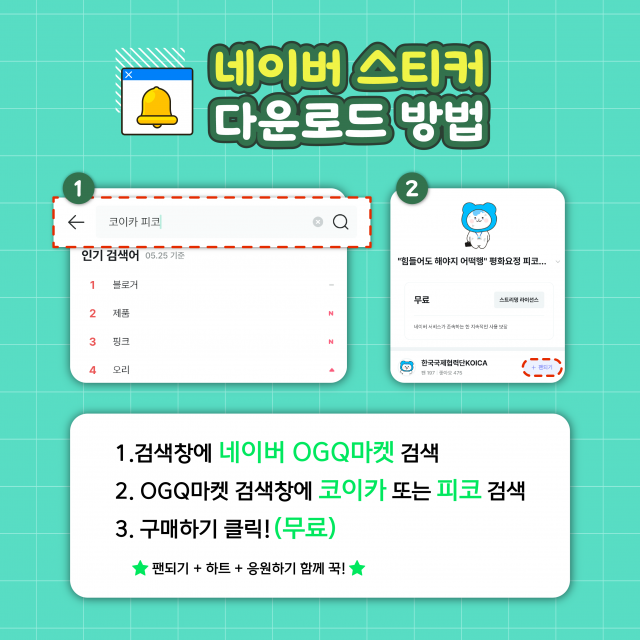 ▲ 코이카가 26일부터 네이버 OGQ 마켓을 통해 무료 배포하고 있는 ‘힘들어도 해야지 어떡행-평화요정 피코(PeKO)의 직장티콘(희망편)’ 갈무리
