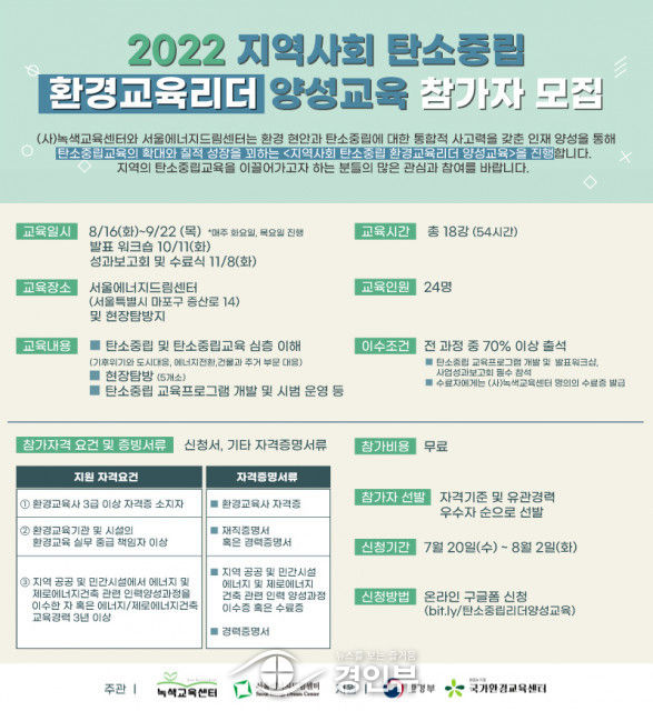서울에너지드림센터(센터장 육경숙)는 환경교육 전문기관인 사단법인 녹색교육센터(센터장 정미경)와 함께 2022년 ‘지역사회 탄소중립 환경교육리더 양성교육’에 참가할 참가자를 모집한다.