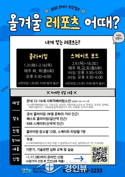 (경인뷰) 부평구 청소년수련관이 오는 17일까지 2023 모여라희망캠프 ‘올겨울 레포츠 어때?’ 참가자를 모집한다.
