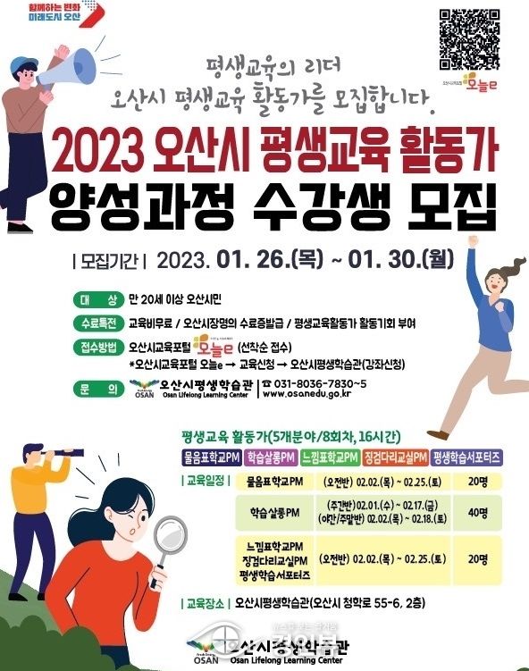 대상은 오산시 거주 만 20세 이상 성인이라면 누구나 지원이 가능하며 각 분야별 교육 접수는 오산시 교육포털 오늘e 홈페이지에서 가능하며 선착순으로 선정된다.
