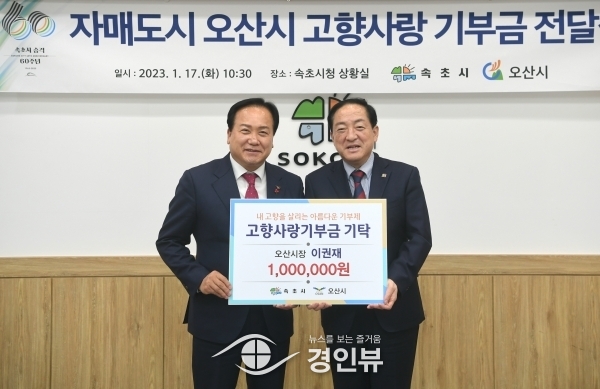 (경인뷰) 오산시는 17일 이권재 시장이 자매도시인 강원도 속초시를 찾아가 고향사랑 기부금을 기탁했다고 밝혔다.