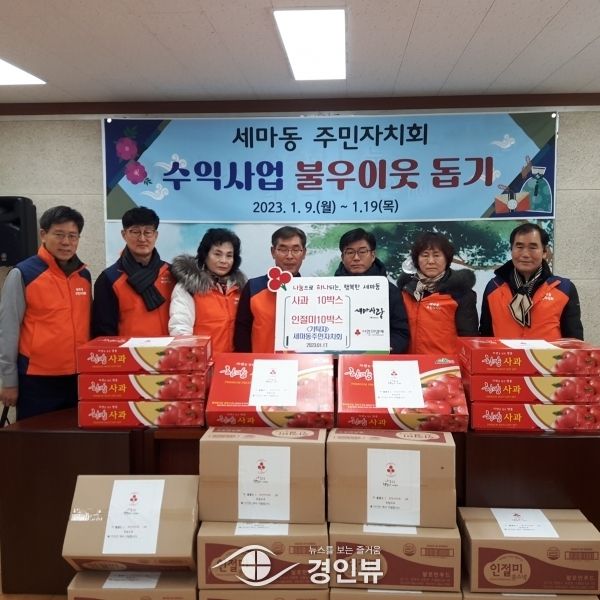 (경인뷰) 오산시 세마동 주민자치회가 지난 17일 설 명절을 앞두고 지역의 어려운 이웃에게 전달해 달라며 이웃돕기 물품을 기부했다.