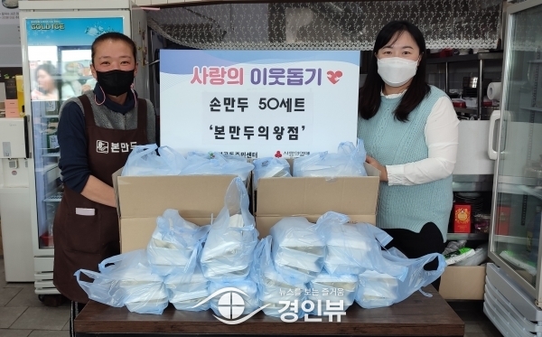 (경인뷰) 지난 20일 의왕시 부곡동에 위치한 본만두 의왕점은 의왕점은 부곡동주민센터에 손만두 50세트를 기탁했다.