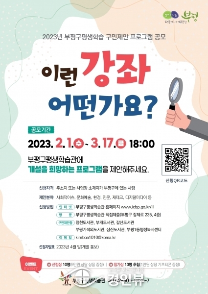 (경인뷰) 부평구가 오는 2월 1일부터 3월 17일까지 ‘부평구 평생학습 구민 제안 프로그램’을 공모한다.