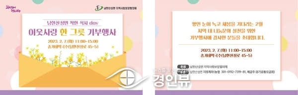 (경인뷰) 광주시 남한산성면 지역사회보장협의체는 오는 2월 7일 남한산성면 광지원리에 위치한 송가네막국수에서 ‘남한산성면 착한 식사 Day 이웃사랑 한 그릇 기부사업’을 개최한다고 31일 밝혔다.