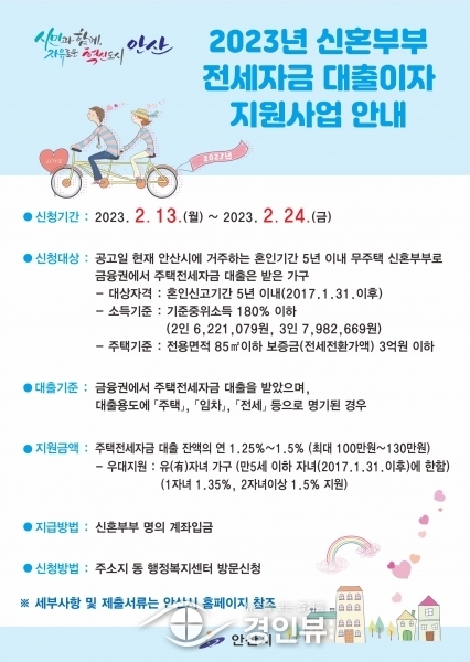 (경인뷰) 안산시는 2023년 신혼부부 전세자금 대출이자 지원사업의 대상자를 모집한다고 1일 밝혔다.