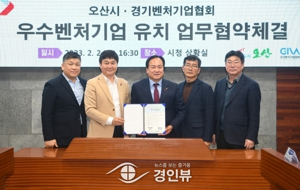시에 따르면 지난 2일 이권재 시장과 경기벤처기업협회 서기만 회장, 박근노 수석부회장 등이 참석한 가운데 시장 집무실에서 경기벤처기업협회와 이 같은 내용의 업무협약을 맺었다.