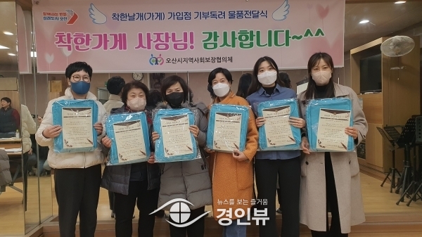 (경인뷰) 오산시지역사회보장협의체는 지난 31일 이웃사랑 실천을 위해 수익금의 일부를 정기적으로 기부하는‘착한날개’에 기부 감사를 위한 물품 전달식을 가졌다.