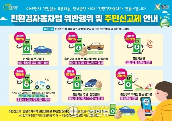 (경인뷰) 광주시는 전기, 수소차 등 환경친화적 자동차 보급 확대를 위해 충전방해 행위 등에 대해 안전신문고 앱을 통한 주민신고제를 운영한다고 3일 밝혔다.