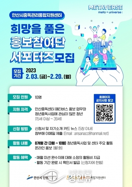 (경인뷰) 안산시 중독관리통합지원센터는 이달 20일까지 중독사업 홍보를 위해 ‘희망을 품은 홍보참여단 서포터즈’를 모집한다고 6일 밝혔다.