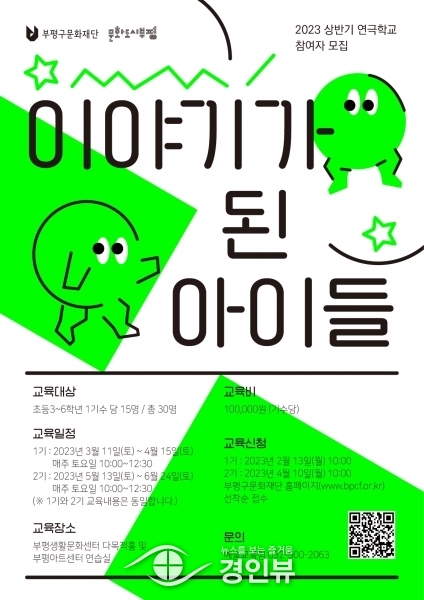 (경인뷰) 부평구 문화재단이 오는 13일부터 2023년 상반기 연극학교 ‘이야기가 된 아이들’ 참여자를 선착순 모집한다.