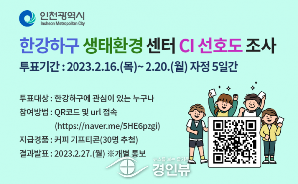 (경인뷰) 인천광역시는 한강하구의 각종 현황정보를 한 눈에 쉽게 분석·파악 할 수 있는 ‘한강하구 생태환경센터 정보시스템’의 디자인 상징 선정을 위한 선호도 조사를 실시할 계획이라고 밝혔다.