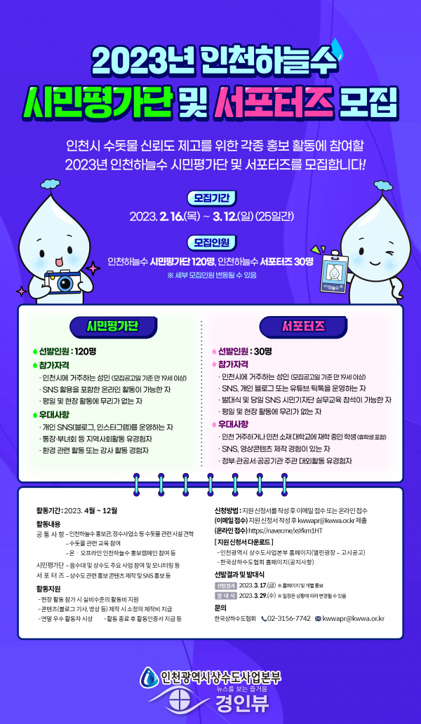 (경인뷰) 인천광역시 상수도사업본부는 상수도 행정의 신뢰를 회복하고 수돗물 품질관리의 객관성을 확보하기 위해 ‘2023년 인천하늘수 시민평가단 및 서포터즈’에 참여할 인천시민을 모집한다고 밝혔다.