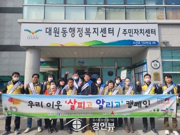 (경인뷰) 오산시 대원동 지역사회보장협의체가 지난 17일 주위의 도움이 필요함에도 복지혜택을 받지 못하는 위기가구 발굴을 위해 “우리 이웃 살피고 알리고” 복지 사각지대 발굴 캠페인을 펼쳤다.