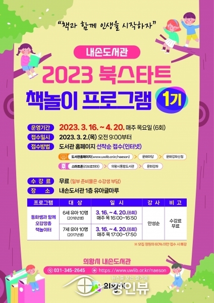 (경인뷰) 의왕시 내손도서관은 ‘책과 함께 인생을 시작하자’는 북스타트 운동의 일환으로 진행하는 ‘2023년 북스타트 책놀이 프로그램 1기’신청자를 3월 2일 선착순 모집한다.