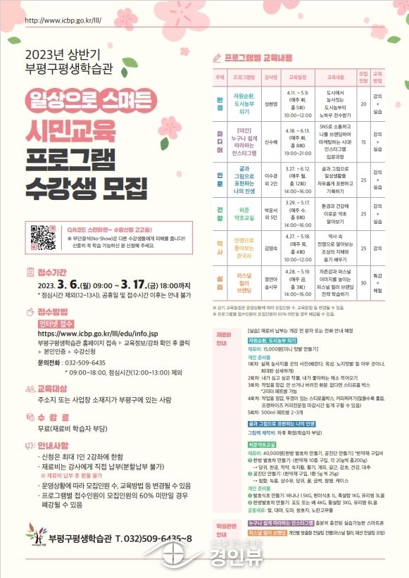 (경인뷰) 부평구 평생학습관이 오는 6일부터 17일까지 ‘2023년 상반기 부평구 평생학습관 시민교육 프로그램’ 수강생을 모집한다.