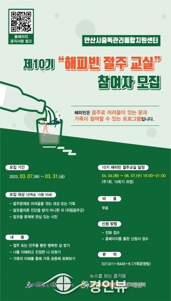 (경인뷰) 안산시 중독관리통합지원센터는 음주로 인한 피해를 예방하고 잃어버린 행복을 찾을 수 있도록 ‘10기 해피빈 절주 교실’ 수강생을 모집한다고 7일 밝혔다.