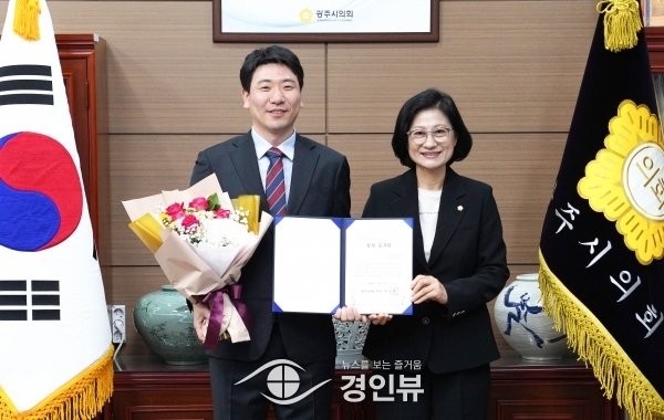 (경인뷰) 광주시의회는 지난 8일 3월의 칭찬릴레이 칭찬 공무원으로 공공사업과 이장범 주무관을 선정 의장실에서 증서를 수여했다.