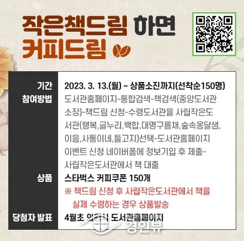 (경인뷰) 의왕시가 3월 13일부터 ‘작은책드림을 신청하면 커피 한잔’이벤트를 실시해 선착순 150명에게 커피 기프트콘을 선물한다.
