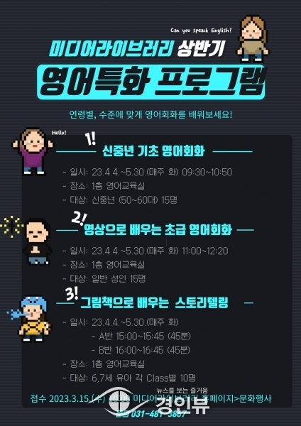 (경인뷰) 안산시 미디어라이브러리는 성인 및 유아를 대상으로 연령별, 수준별 맞춤형 영어 회화 프로그램을 운영한다고 13일 밝혔다.