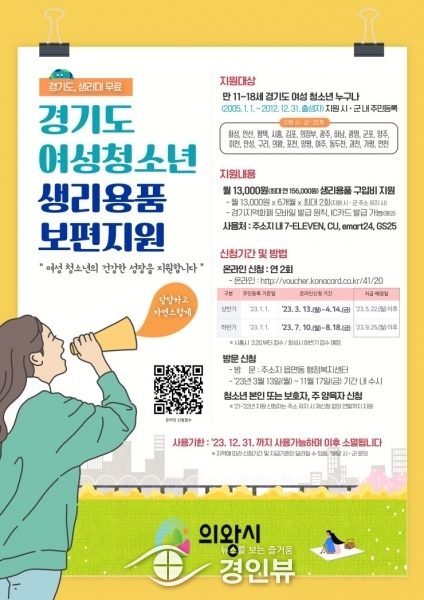 (경인뷰) 의왕시가 올해부터 ‘여성청소년 생리용품 보편지원사업’으로 의왕시에 주민등록이 되어 있는 만 11~18세 모든 여성청소년에게 생리용품 구매비를 지원한다.