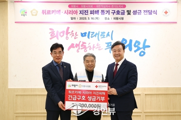 (경인뷰) 의왕시와 의왕시의회는 튀르키예·시리아 지진 피해 복구와 인도적 구호활동 지원을 위한 성금 3,000만원을 대한적십자사에 기탁했다고 16일 밝혔다.