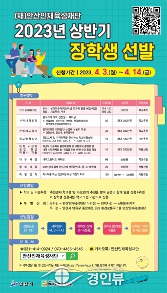 신청 기간은 4월 3일부터 14일까지로 장학금마다 선발기준과 금액, 방식이 달라 안산시인재육성재단 및 안산시 누리집을 통해 확인 후 신청해야 한다.