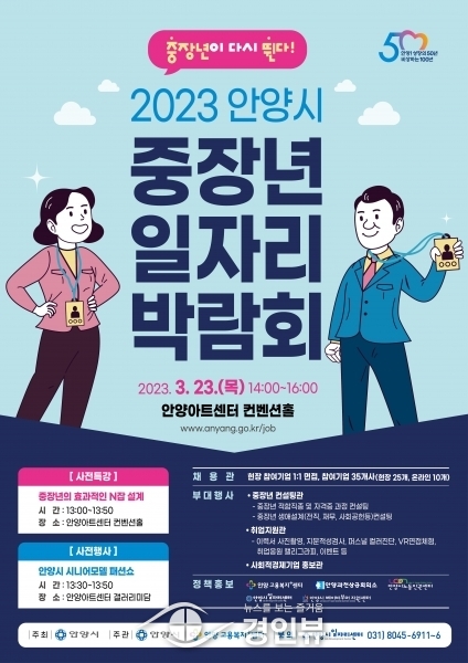 (경인뷰) 안양시가 중장년층의 고용을 촉진하기 위한 박람회 ‘중장년이 다시 뛴다’를 오는 23일 오후 2~4시 안양아트센터 컨벤션홀에서 개최한다고 17일 밝혔다.